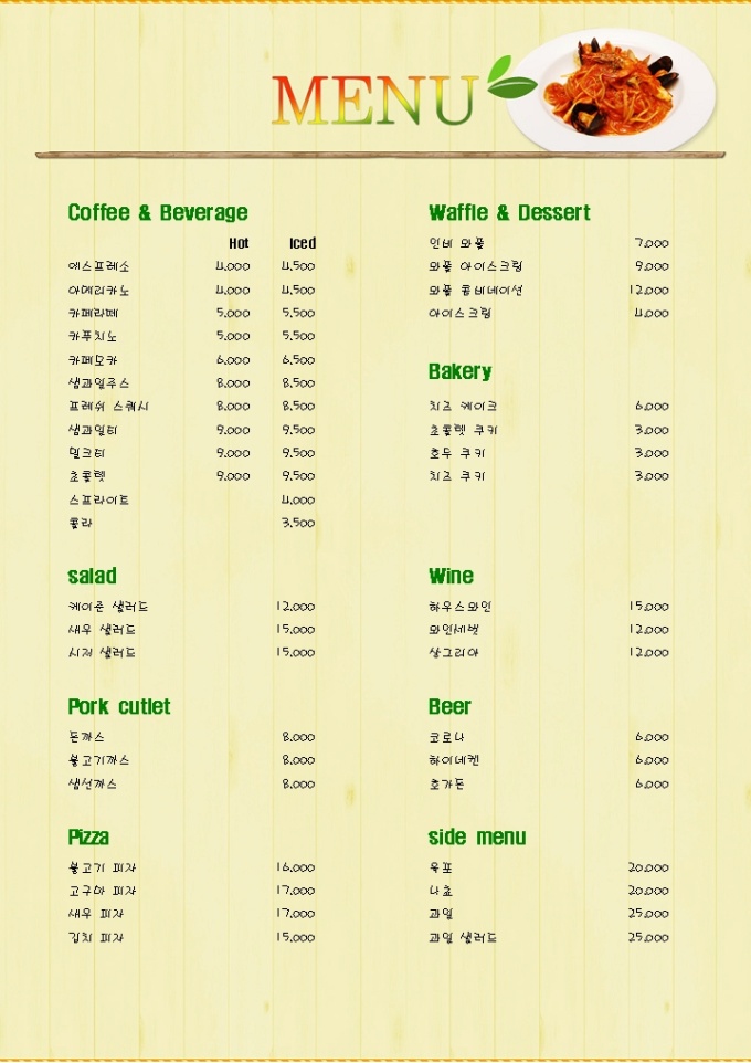 레스토랑이나 식당 등에서 사용할 수 있는 메뉴판입니다.