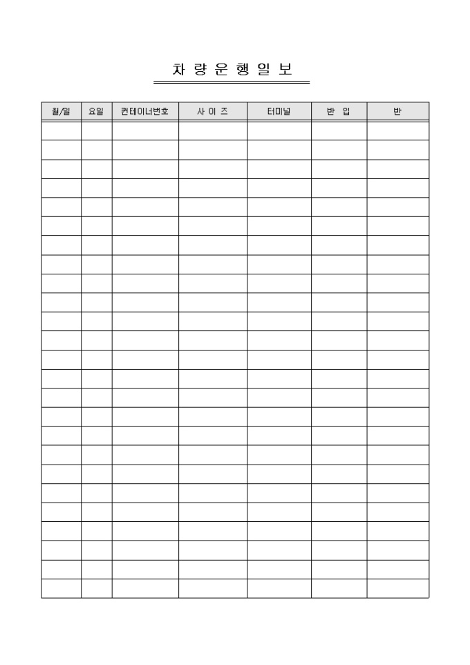 9,000원/월날짜, 요일, 컨테이너번호, 사이즈, 터미널 등의 항목으로 구성되어있는 차량운행일보입니다.