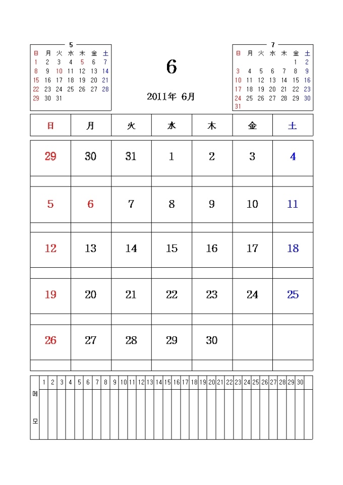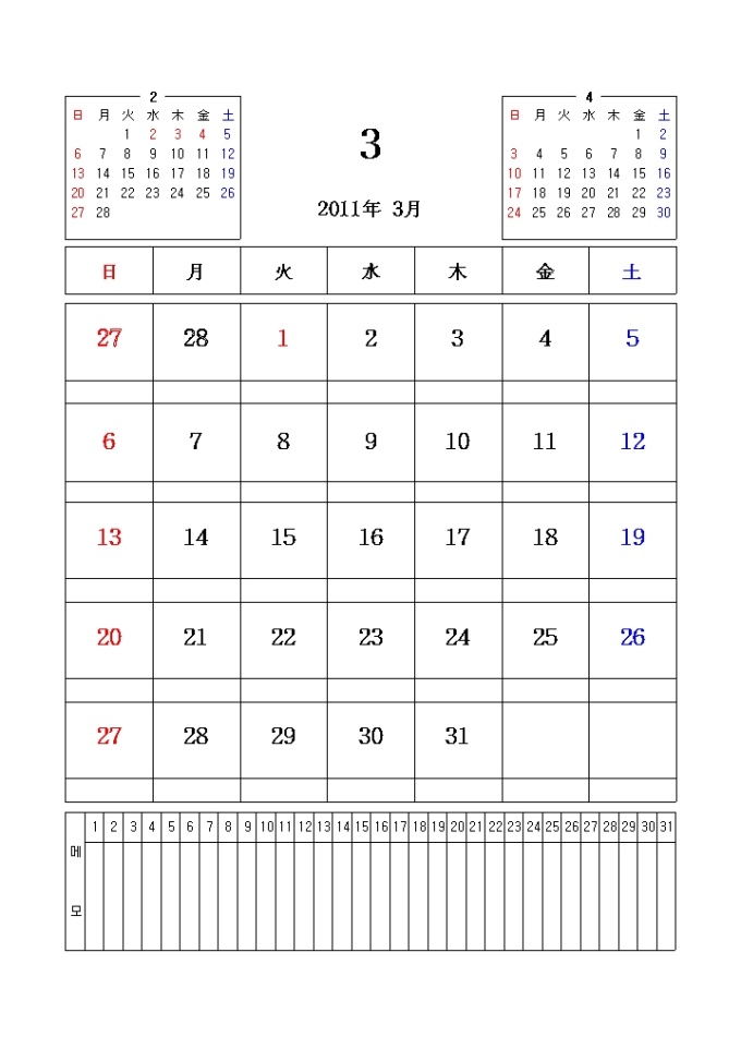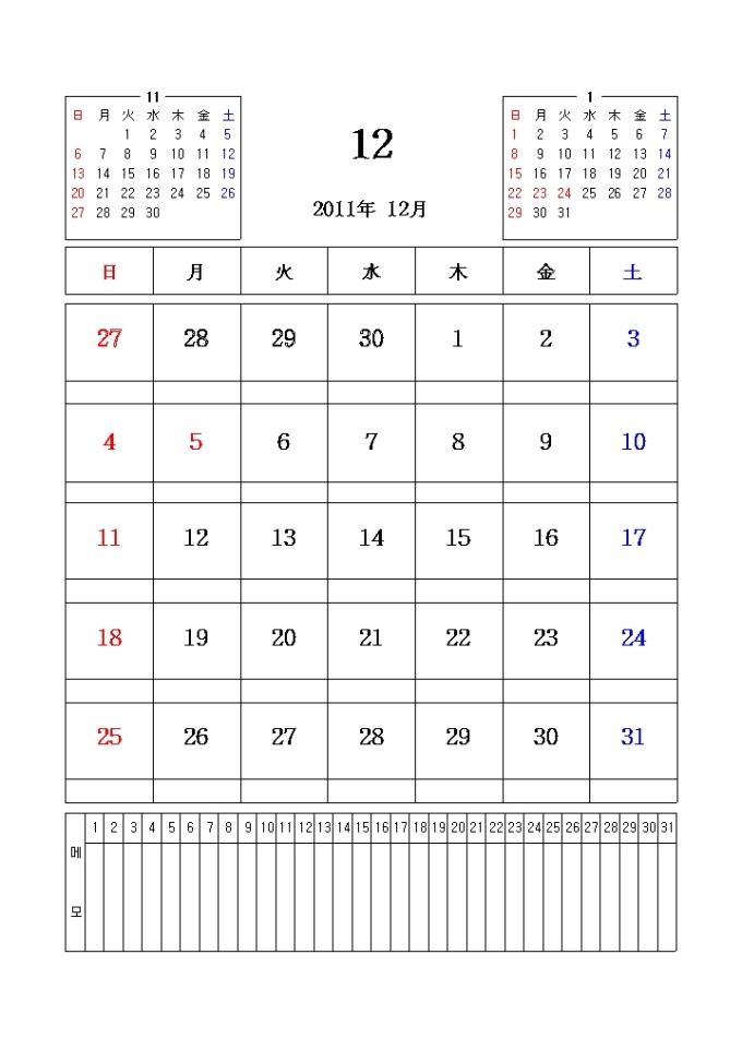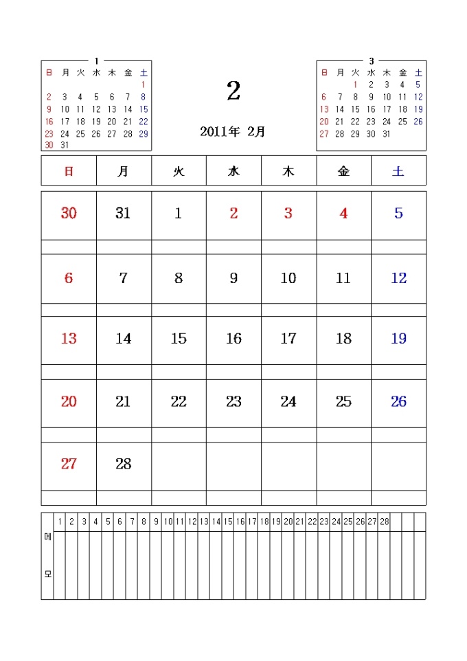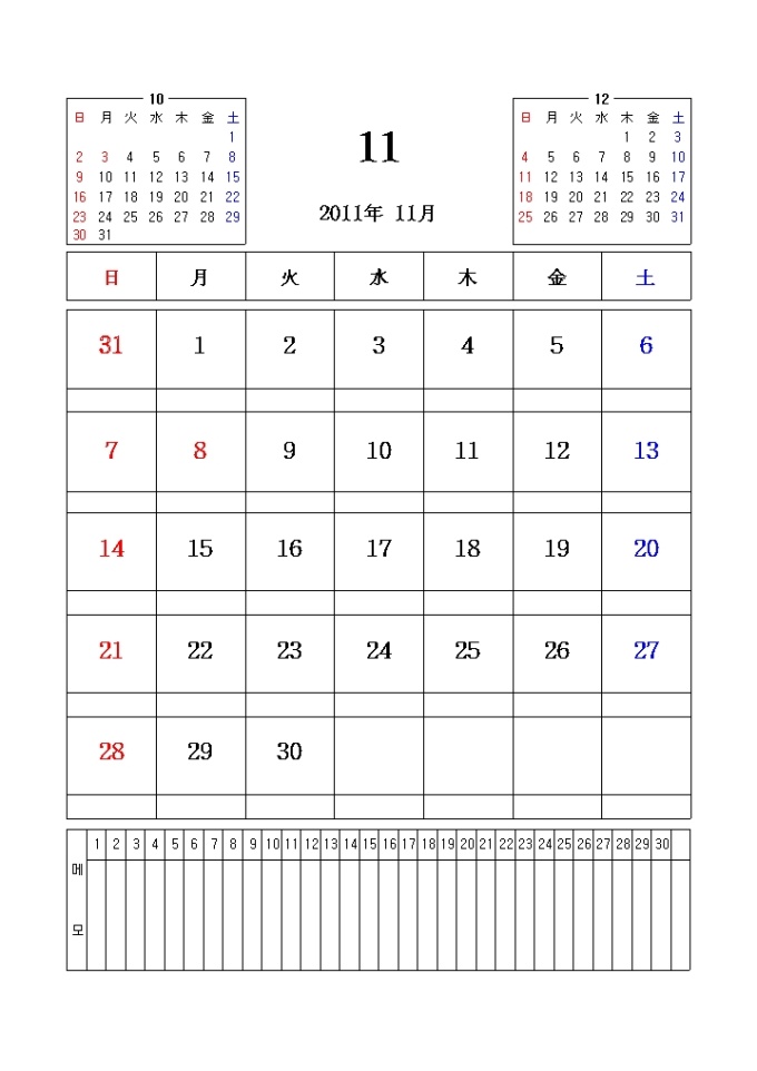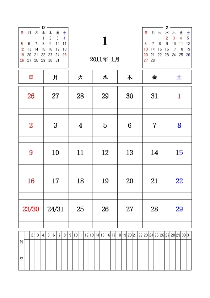 2011년 달력입니다. 전월과 이월이 함께 표시되어있으며 메모란이 포함되어있습니다.