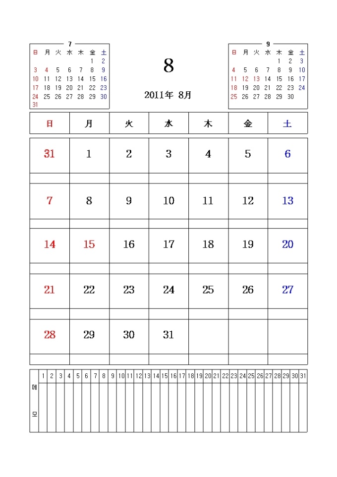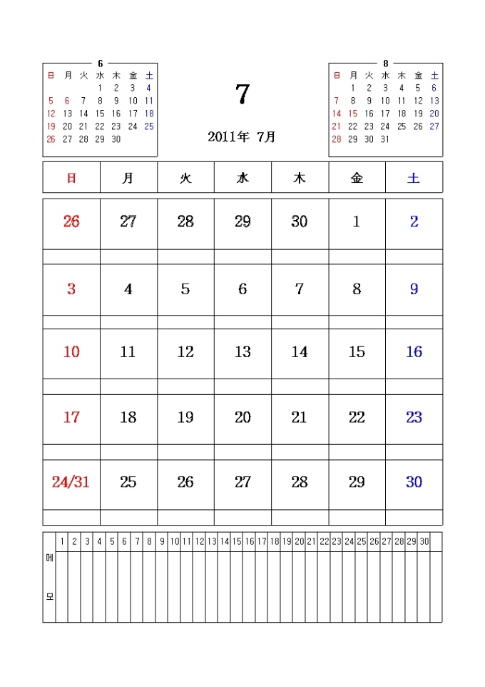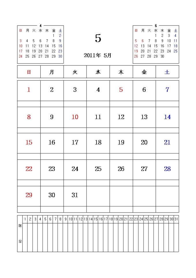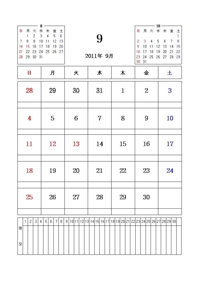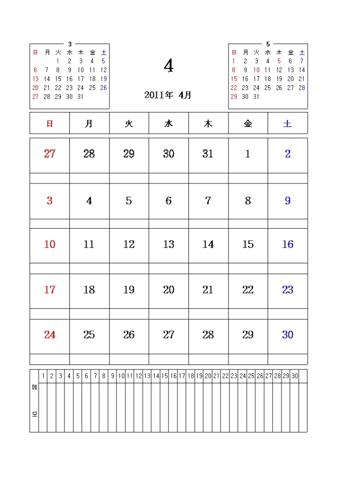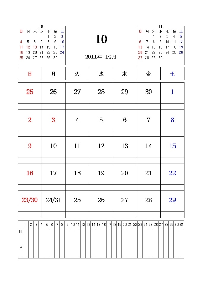 2011년 달력입니다. 전월과 이월이 함께 표시되어있으며 메모란이 포함되어있습니다.