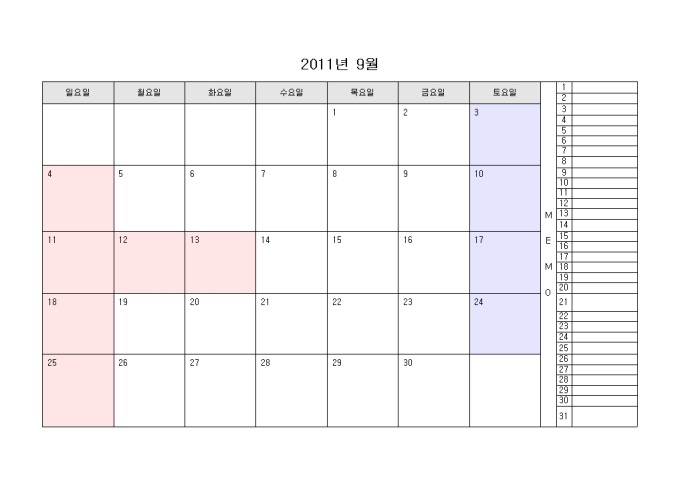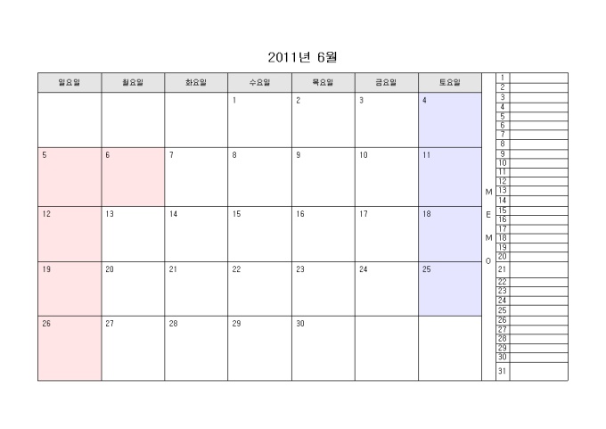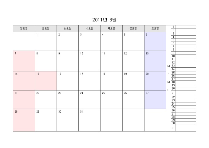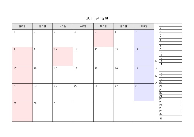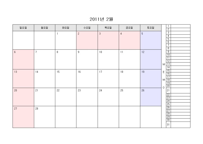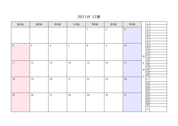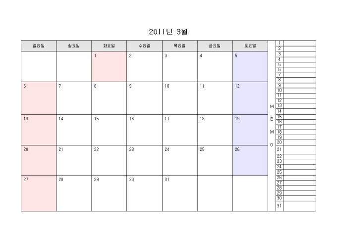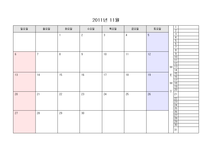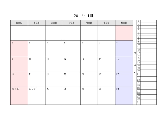 2011년 달력입니다. 월별로 구성되어있으며 오른쪽에 메모를 할 수 있습니다.