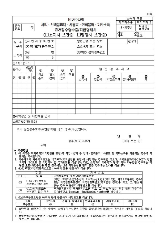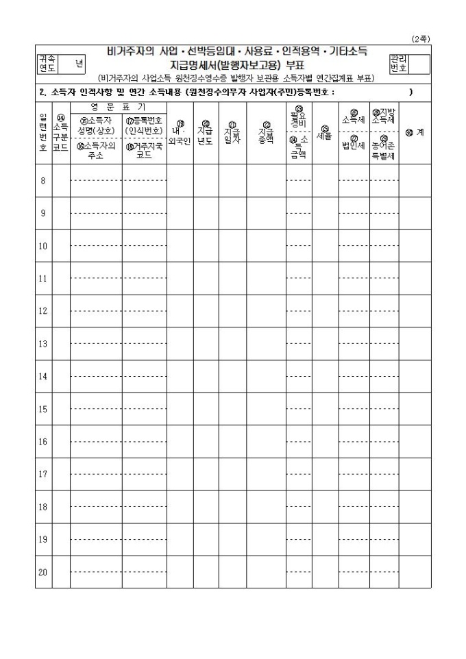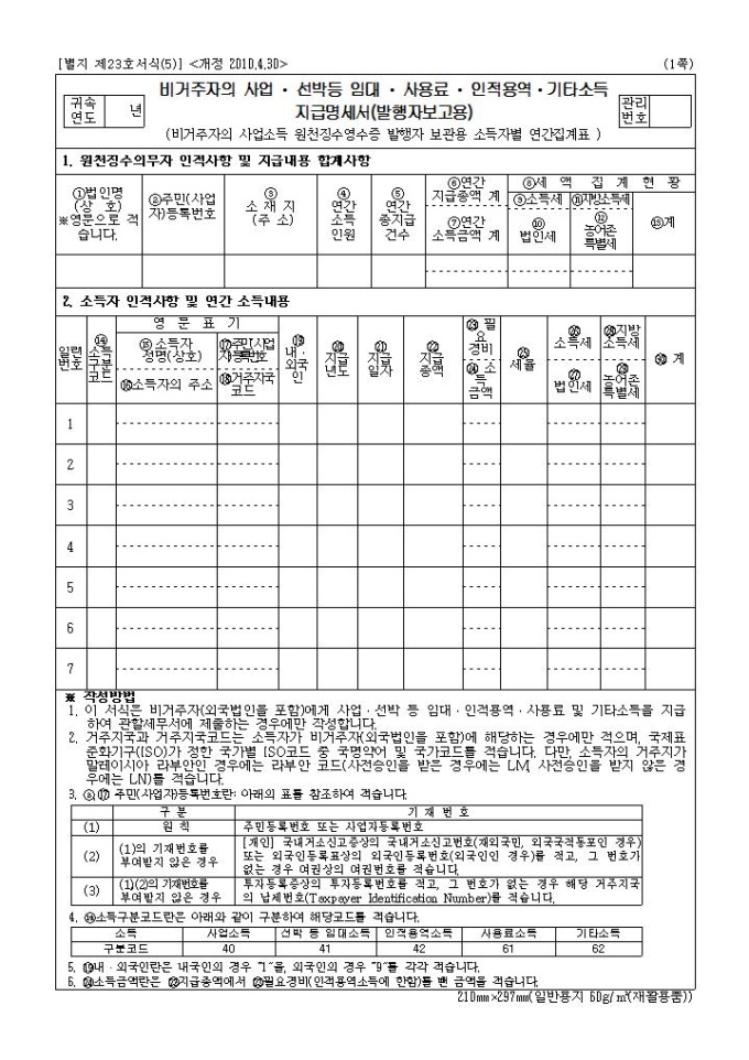 [2010년 연말정산]비거주자의사업·선박등임대·사용료·인적용역·기타소득지급명세서