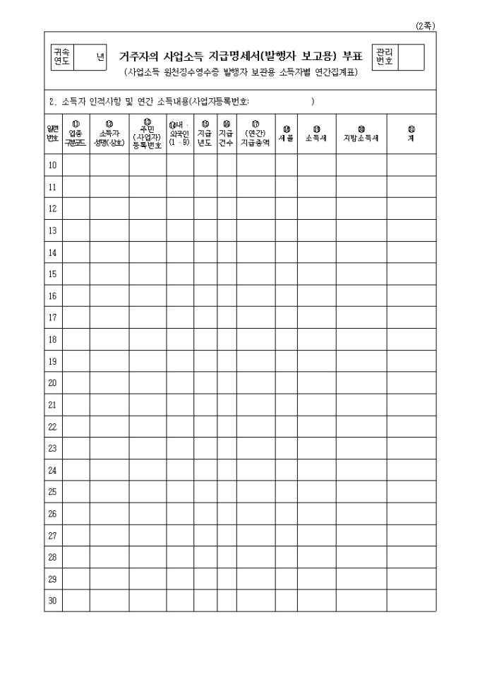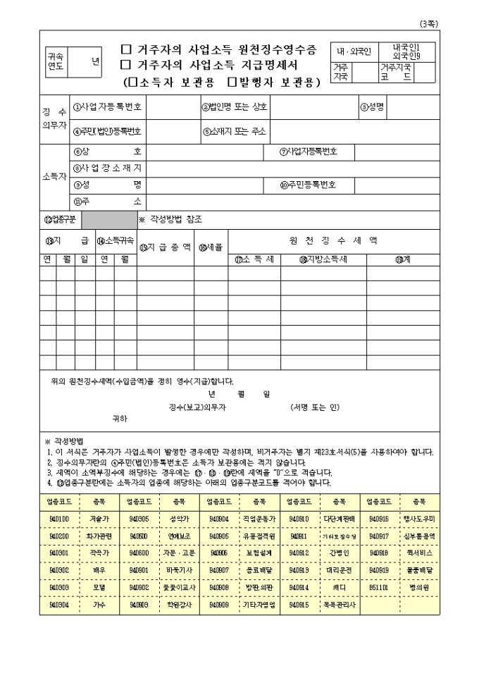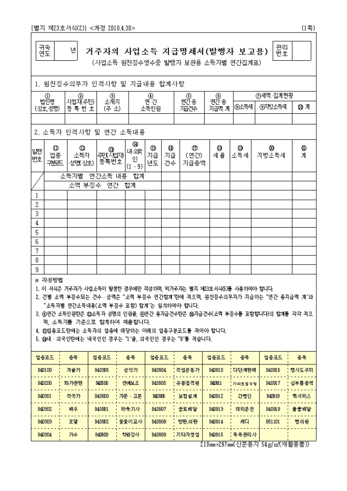 9,000원/월2010년 연말정산 제출서류인 사업소득원천징수영수증(매월원천징수용), 사업소득지급명세서(매월원천징수용)입니다.