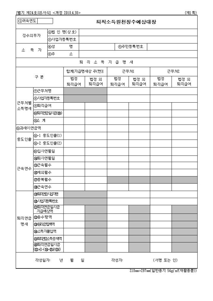 9,000원/월2010년 연말정산 제출서류인 퇴직소득원천징수예상대장입니다.