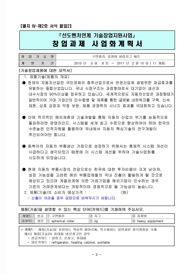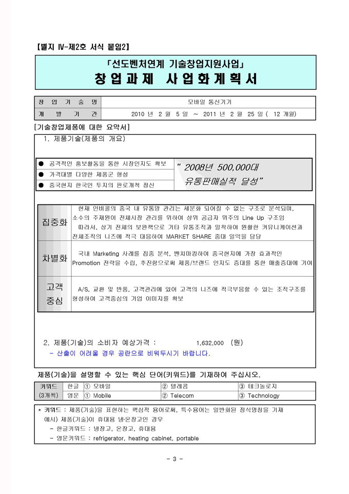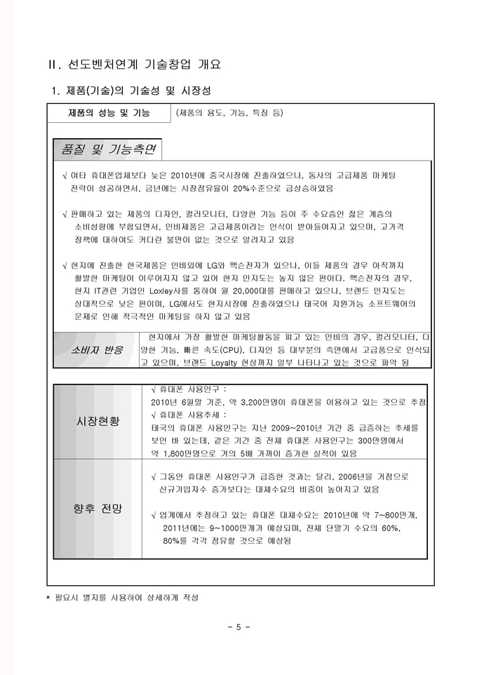 9,000원/월국내유일! 선도벤처연계 사업계획서 샘플로써 제조업, 생산, 통신등 3가지 업종으로 구성되어 있습니다. 2011년 정부에서 지원하는 선도벤처연계 기술창업지원사업은 지원규모는 총 30억원(기술창업자당 90백만원지원)이며, 창업 후 1년 이내의 기업 또는 창업을 준비하고자 하는 예비 창업팀에게 좋은 기회가 될 것입니다.