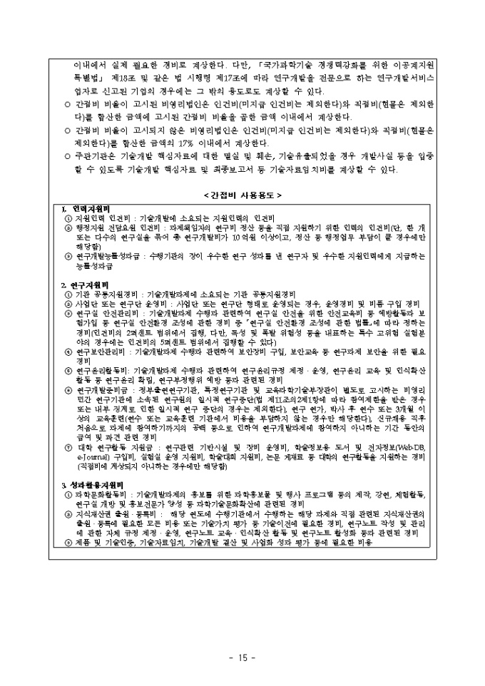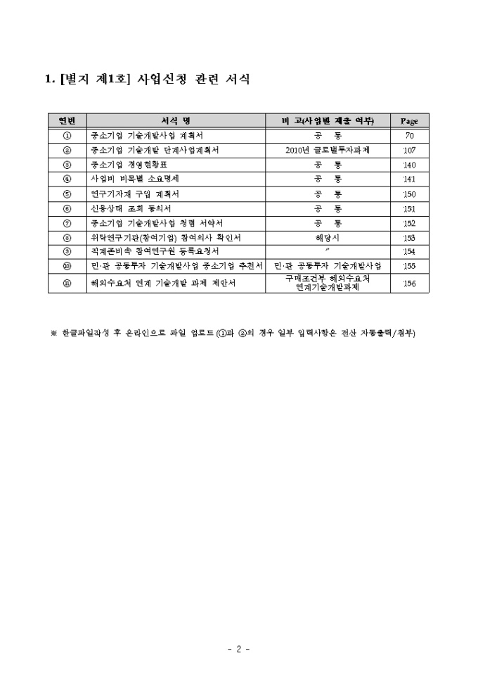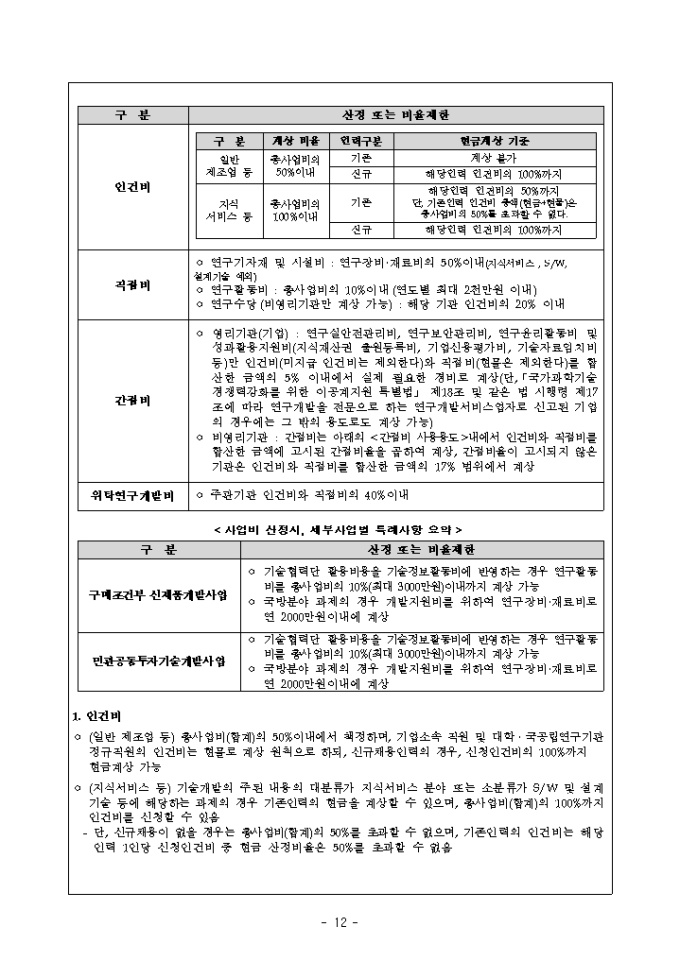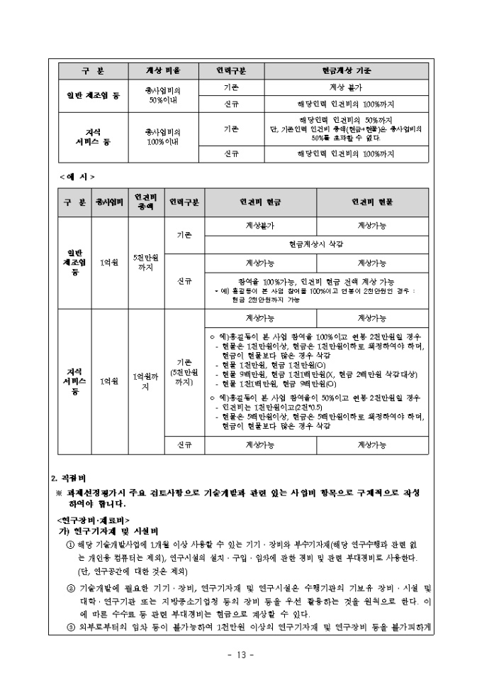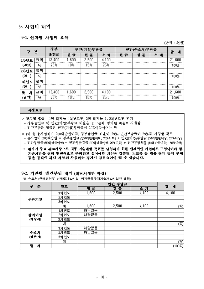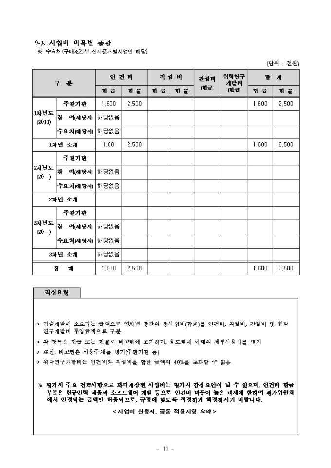 2011년 지원규모 : 100억원 정부출연금 : 총사업비의 75%이내에서 1년간 최대 2억원까지 지원 민간부담금 : 중소기업은 총사업비의 25%이상을 부담 (민감부담금의 20% 이상은 현금으로 부담하여야 함) |