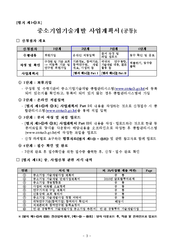 1단계 : 온라인(http://smtech.go.kr)을 통한 사업계획서 접수 2단계 : 과제관리 및 과제신청 지원사업 선택 3단계 : 온라인 내용입력 및 사업계획서(구비서류) 등록