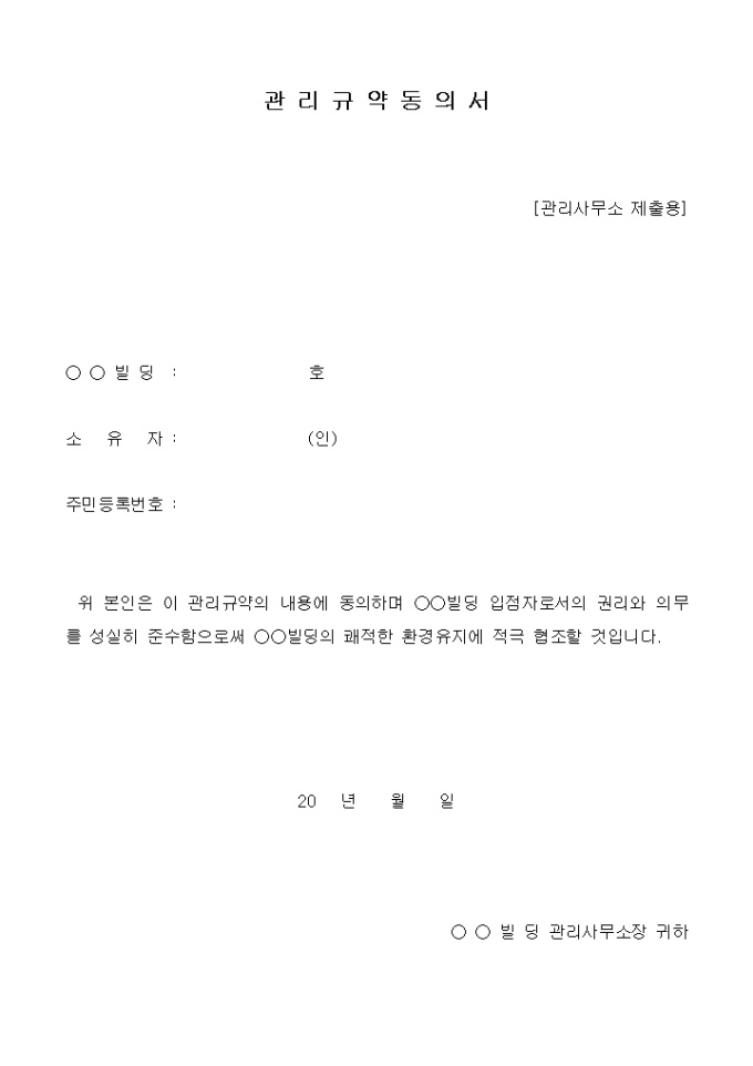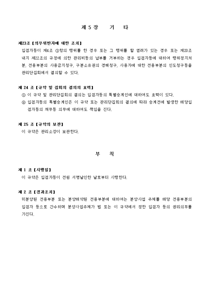 9,000원/월목적, 용어의 정의, 규약 대상물의 범위, 입점자 등의 권리의무 등 25개 조항으로 구성되어있는 집합건물(상가)관리규약입니다.