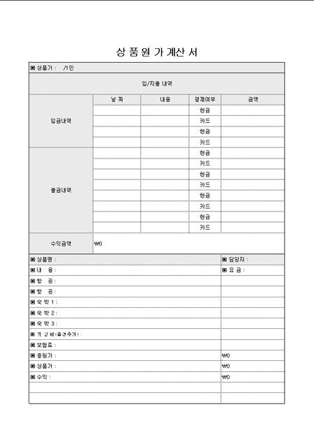 9,000원/월상품원가계산서 엑셀 서식입니다.