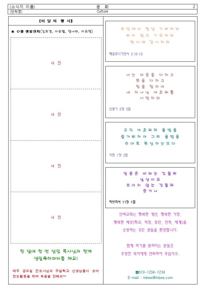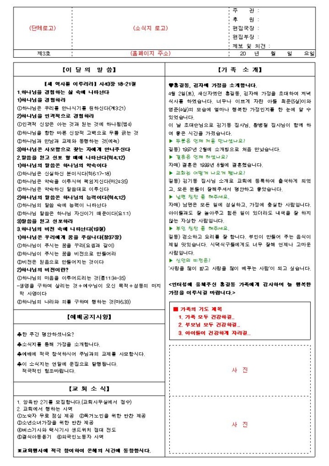 9,000원/월교회에서 활용할 수 있도록 제작된 소식지 샘플입니다.