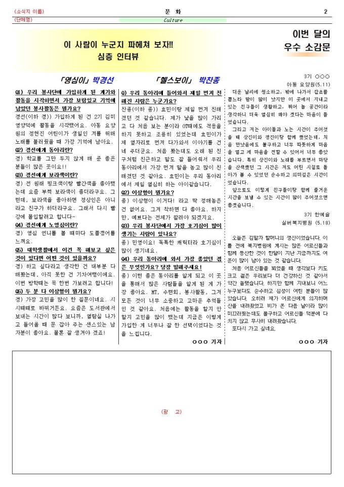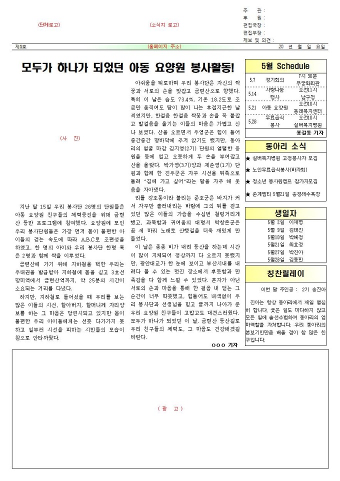 봉사동아리에서 활용할 수 있도록 B4로 제작된 소식지 샘플입니다.