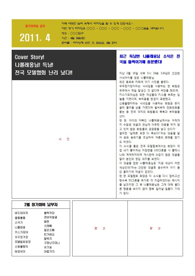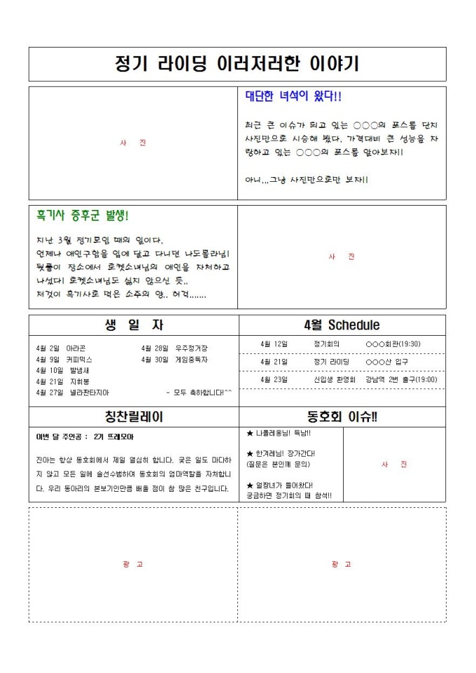 자전거동호회에서 활용할 수 있도록 B4용지로 제작된 소식지 샘플입니다.