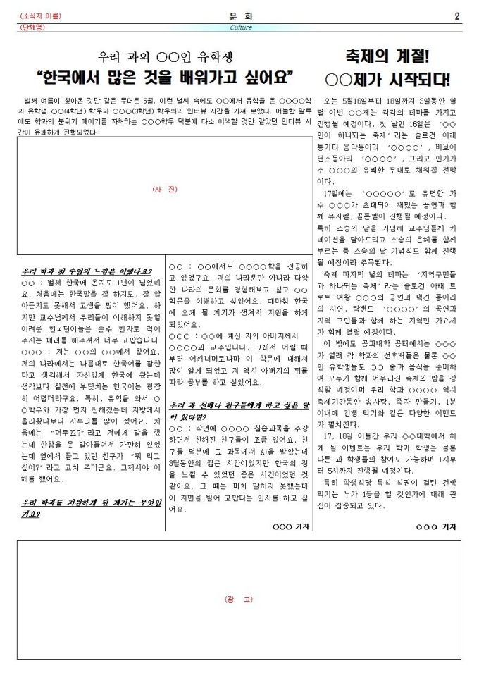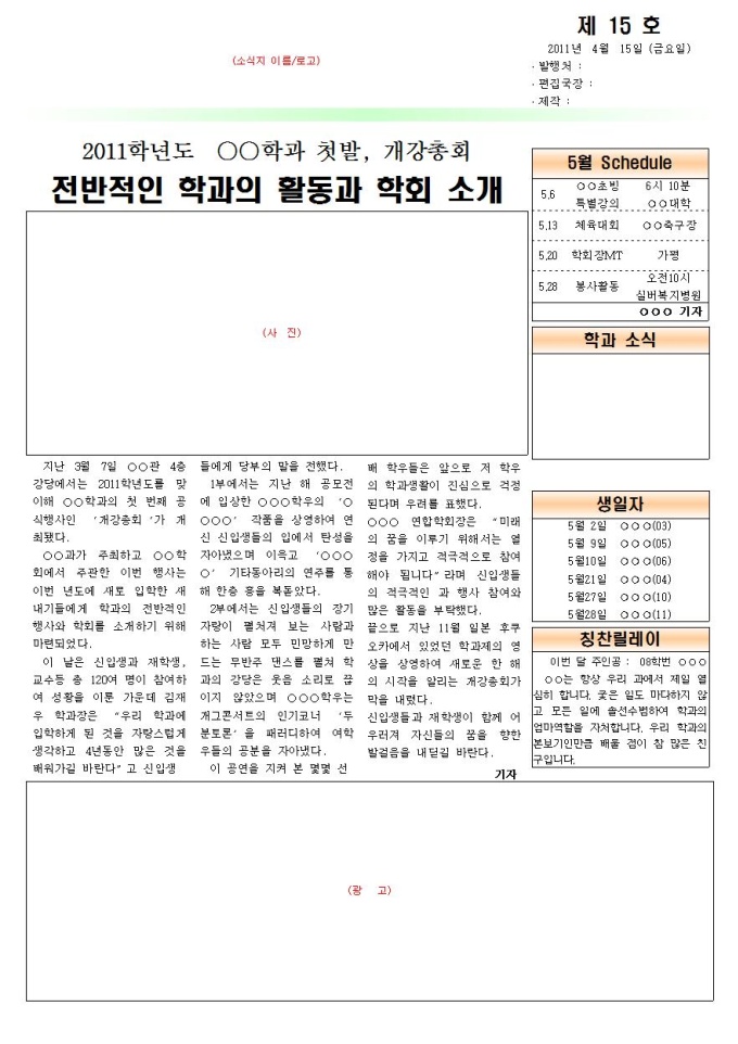 9,000원/월대학교 학과신문 등으로 활용할 수 있도록 B4용지로 제작된 소식지 샘플입니다.