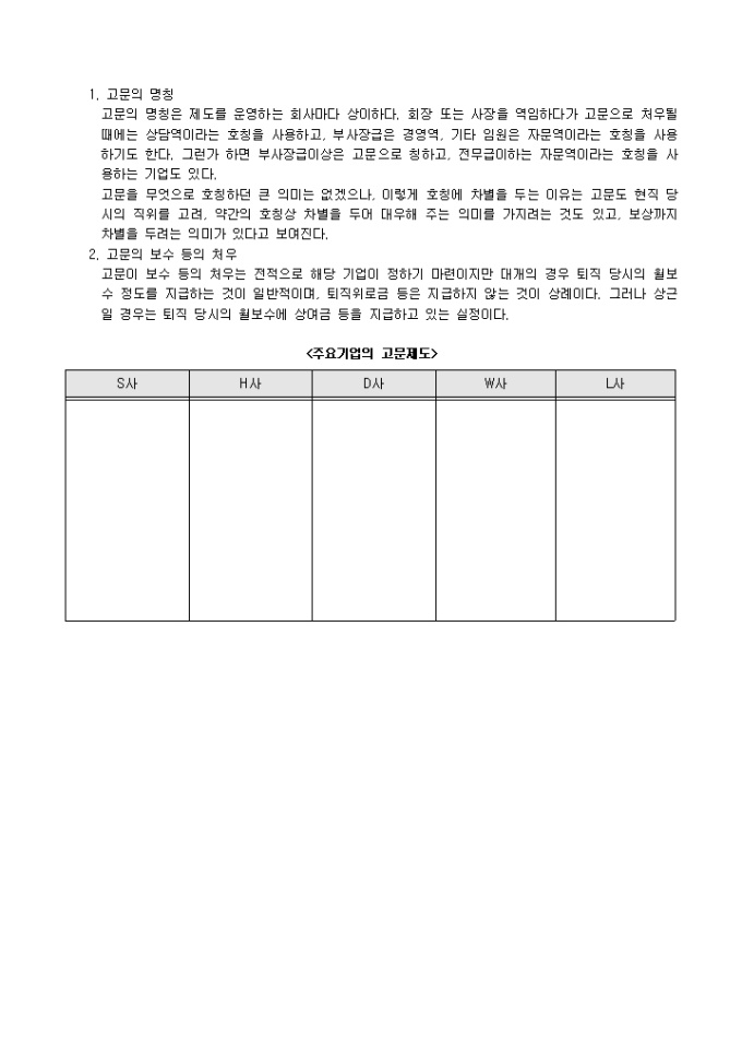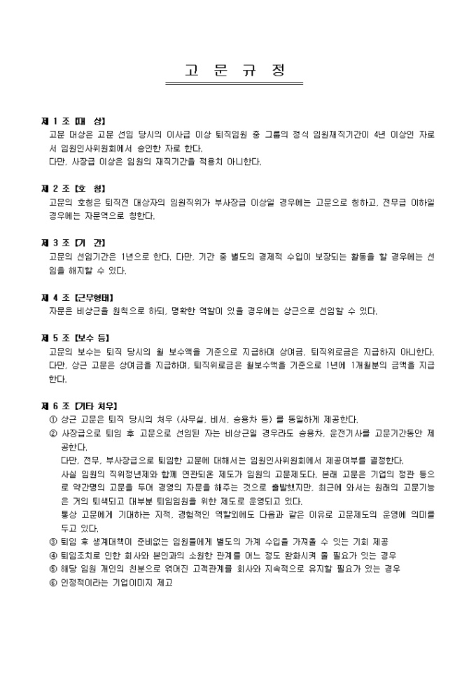 9,000원/월대상, 호칭, 기간, 근무형태, 보수 등 6개 조항으로 구성되어있는 고문규정입니다.