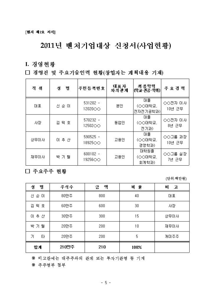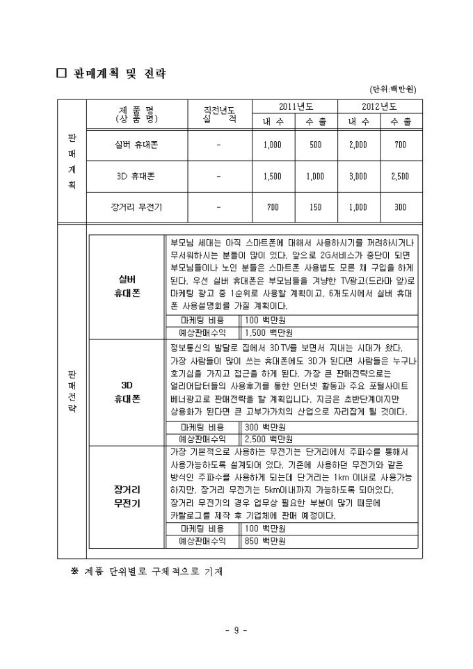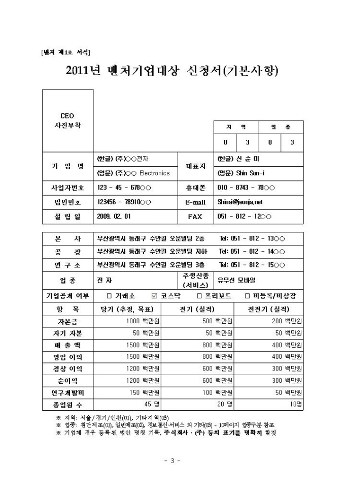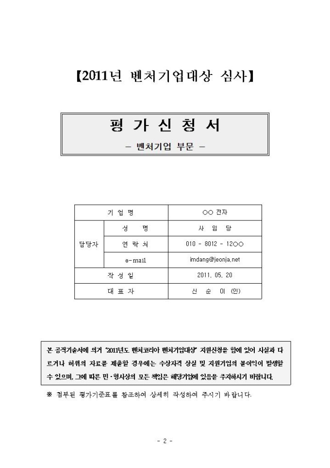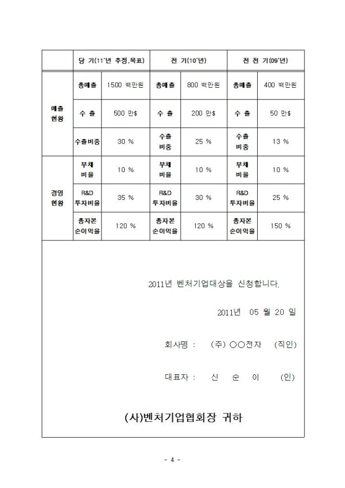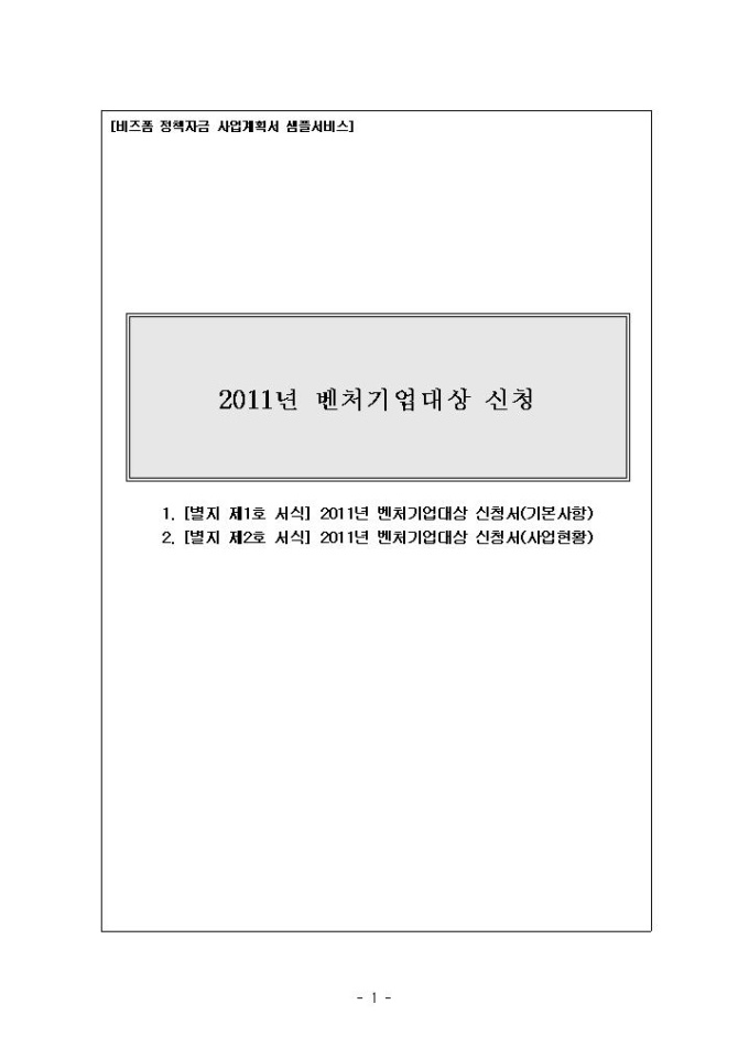 2011년 벤처기업대상 신청 사업계획서 샘플 |