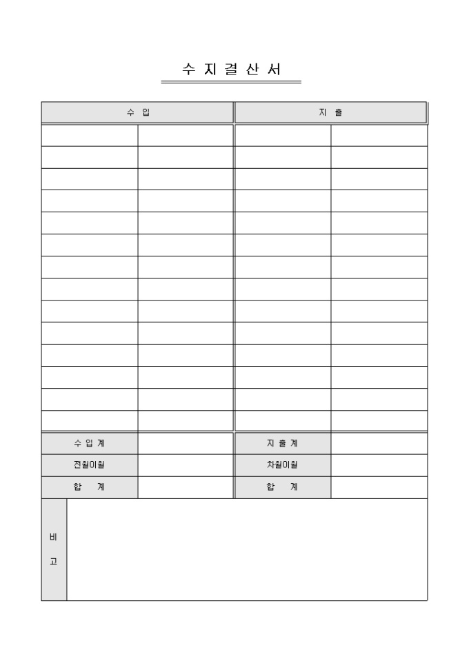9,000원/월수입과 지출에 관한 사항을 기록하고 수지결산을 할 수 잇는 수지결산서입니다. 수입, 지출, 수입계, 지출계 등의 항목으로 구성되어있습니다.