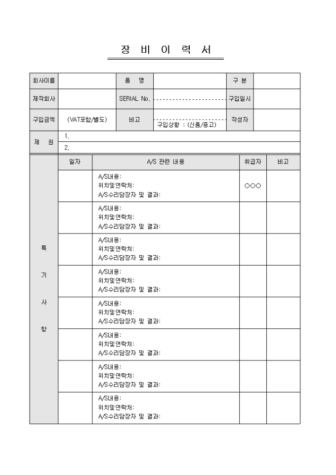회사이름, 제작회사, 구입금액, 제원, 일자 등의 항목으로 구성되어있는 장비이력서입니다.