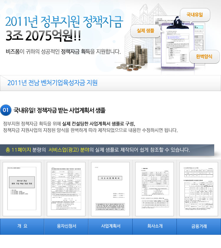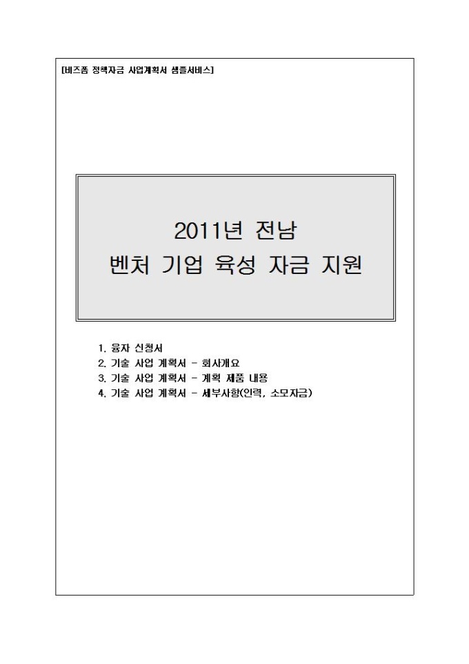 국내 최초! 비즈폼에서 처음으로 '2011년 전남 벤처기업육성자금 지원 사업계획서 샘플' 샘플을 제공합니다. 우수한 벤처기업을 위한 사업계획서입니다.