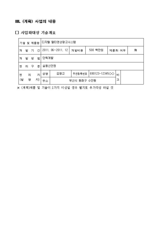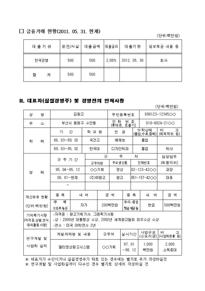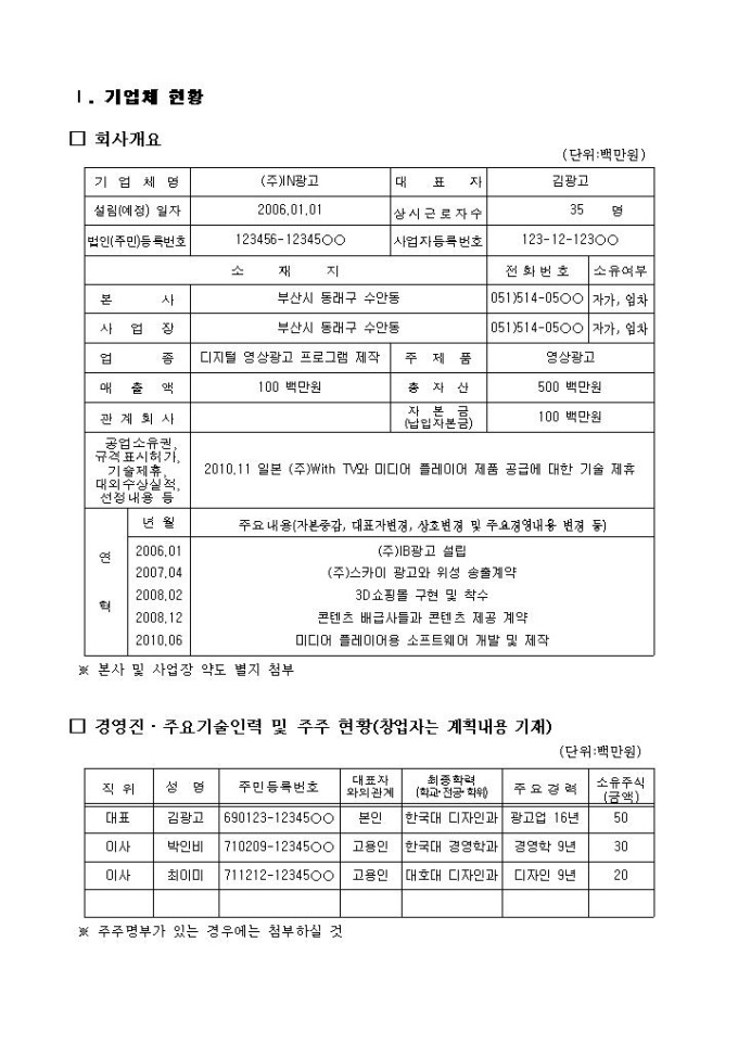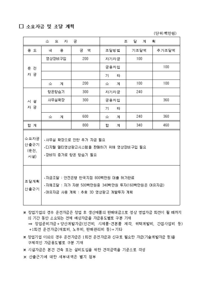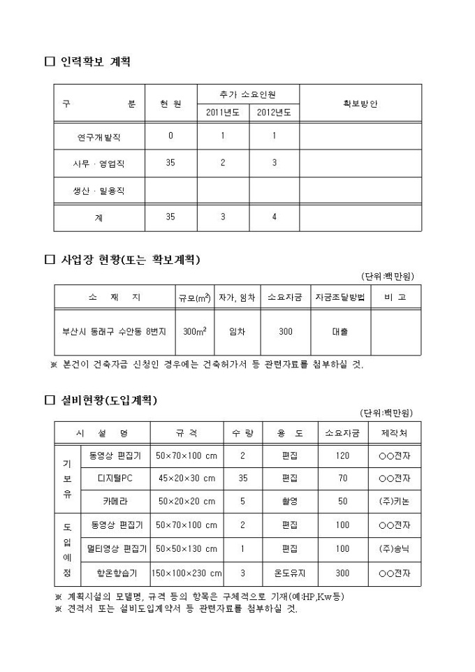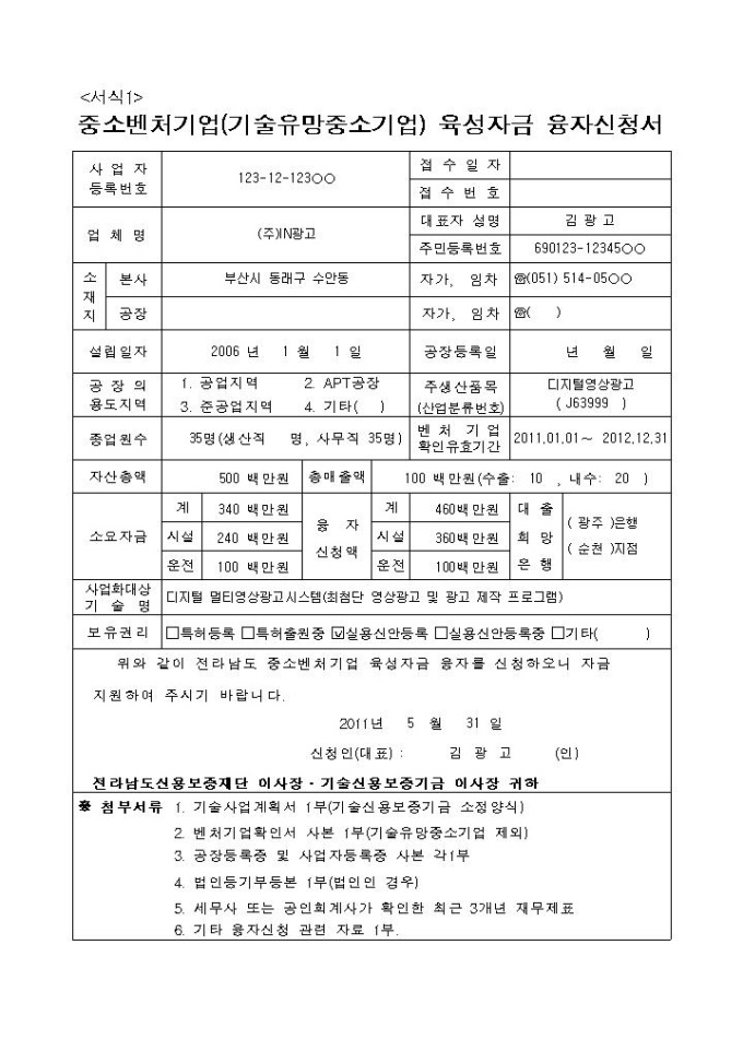 2011년 전남 벤처기업육성자금 지원 사업계획서 샘플
