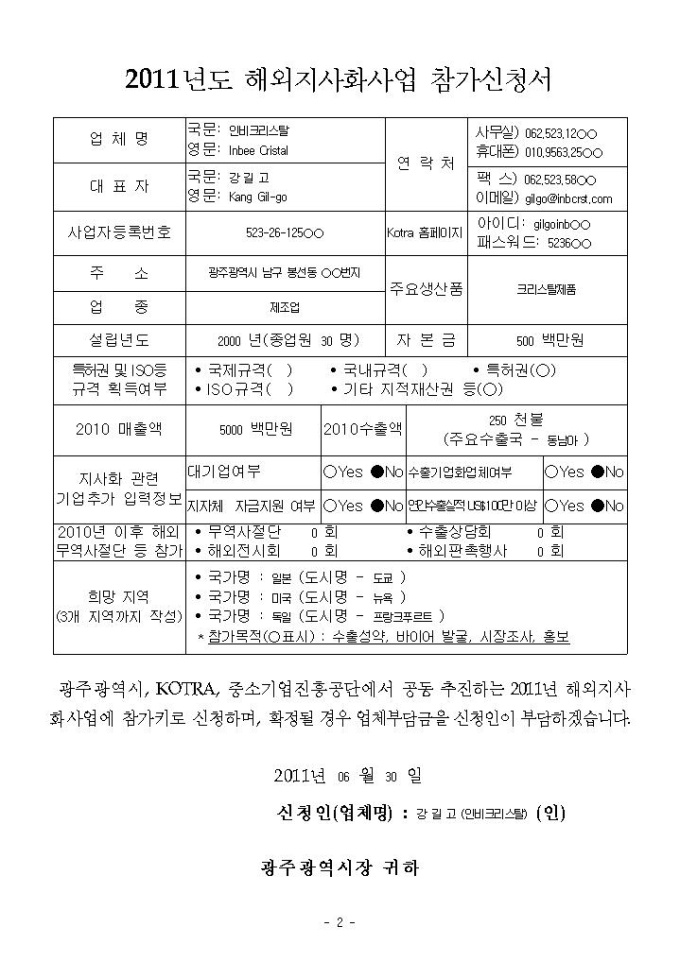 2011년 광주 해외지사화 지원 사업계획서 샘플