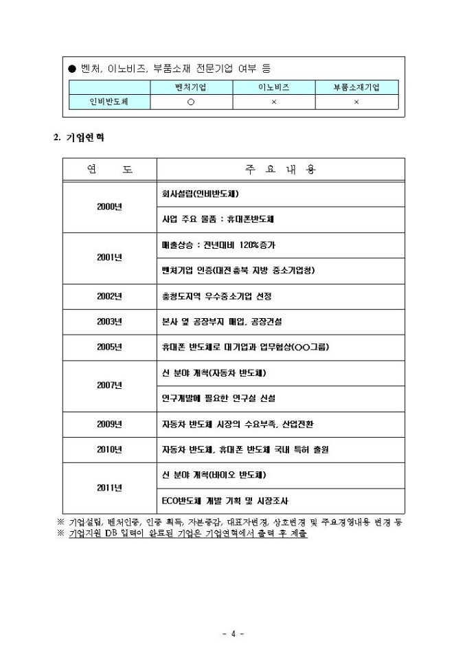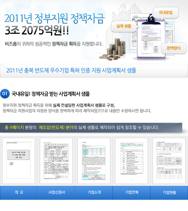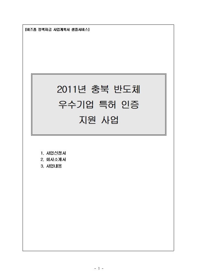 국내 최초! 비즈폼에서 처음으로 '2011년 충북 반도체 우수기업 특허 인증 지원 사업계획서 샘플' 샘플을 제공합니다. 우수한 벤처기업을 위한 사업계획서입니다.