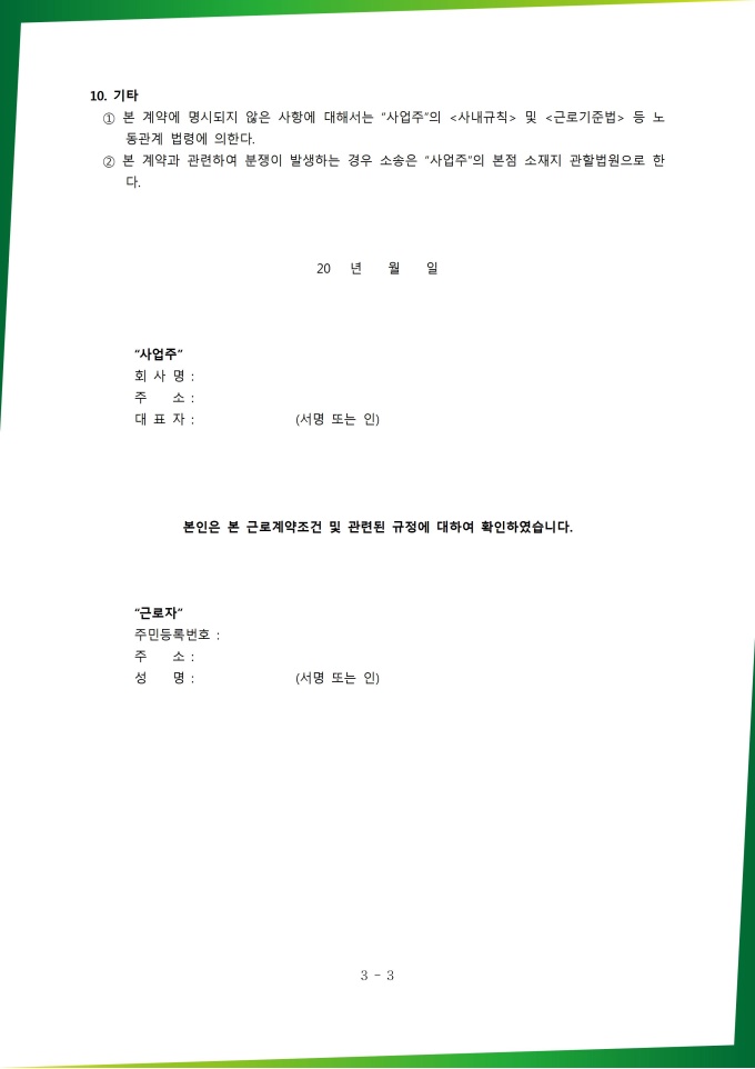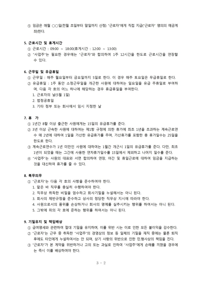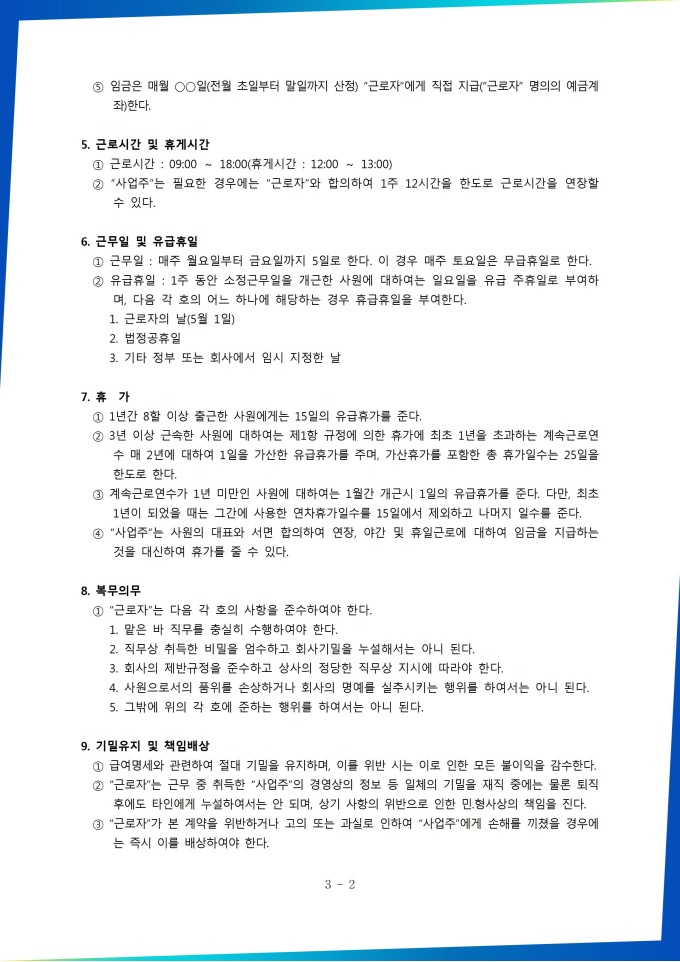 9,000원/월표준 연봉근로계약서(주40시간)는 근로자와 회사가 연봉제를 기반으로 주 40시간 근무 조건을 명시하여 체결하는 공식 문서입니다. 이 계약서에는 근로 기간, 연봉 및 지급 방식, 근무 시간, 휴가, 복리후생, 퇴직 조건 등 근로와 관련된 핵심적인 사항들이 구체적으로 포함됩니다. 법적 기준을 준수하며 투명하고 명확한 근로 관계를 설정하여 양측의 권리와 의무를 보호하는 데 중요한 역할을 합니다.