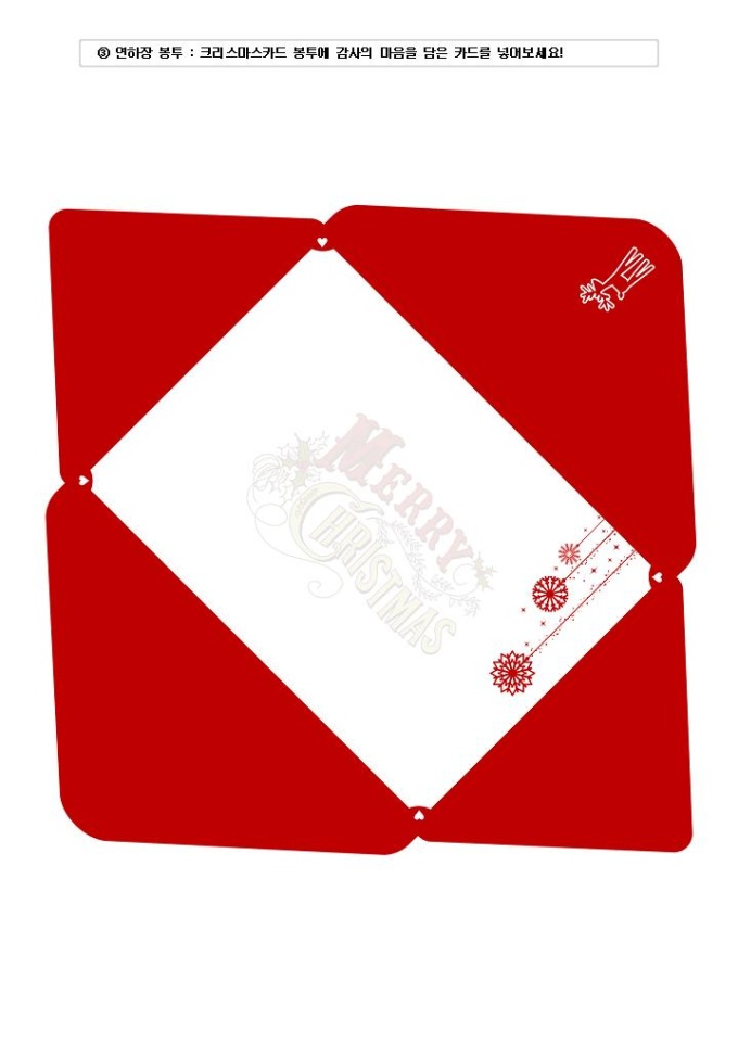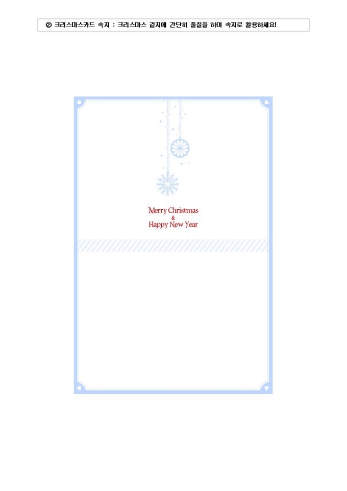 크리스마스 카드와 봉투(눈내리는들판) 속지, 겉지, 봉투로 구성되어 있어 출력하여 사용할 수 있습니다. 겉지 안에 간단한 풀을 이용해서 속지를 붙이고 인사말을 써 봉투에 담으시면 됩니다. DM, 거래처, 고객, 지인, 친구, 가족에서 인사와 안부를 전할 때 활용하세요.