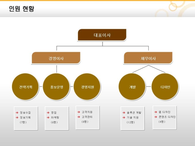 비스듬한 사각형과 원형모양의 조직도 입니다. 다양한 사업계획서에 활용하실 수 있습니다.