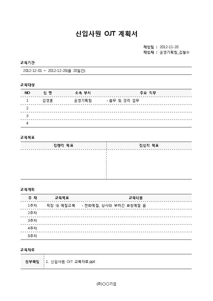 신입사원 OJT 계획서입니다. 교육기간, 교육대상, 교육목표, 교육계획 등의 항목으로 구성되어 있습니다. OJT 계획서를 작성하실 때 참고하실 수 있습니다.
