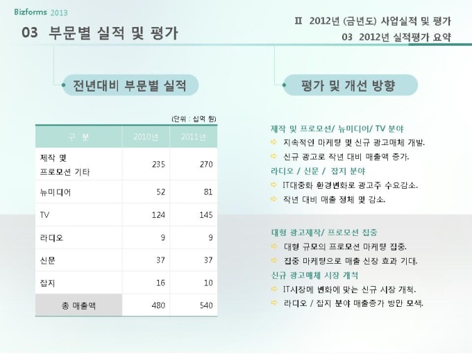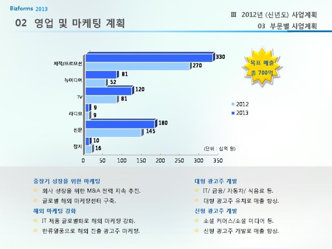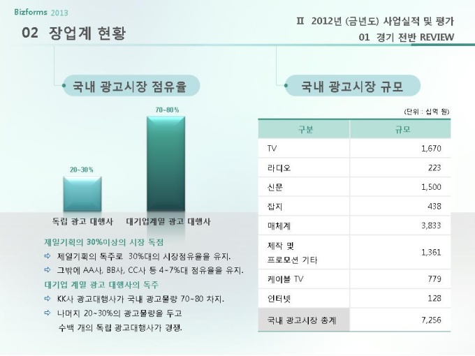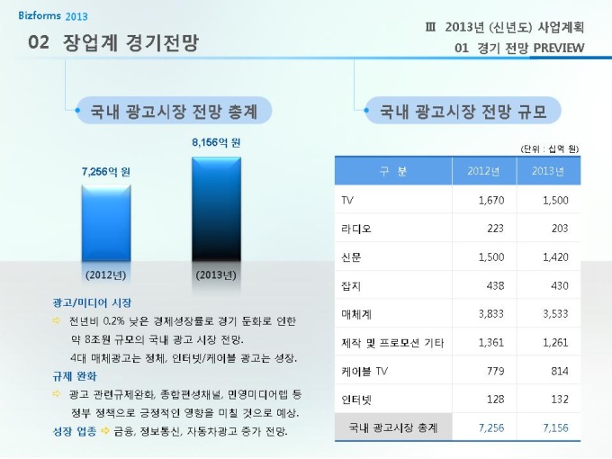 미디어, 디자인 분야의 표준 신년도 사업계획서입니다. 실제 사업 사례로 들어 작성한 사업계획서 샘플이며, 어느 분야에도 적용이 되는 표준 목차로 구성되어 있습니다. 자신의 사업에 맞게 다양하게 활용하세요.