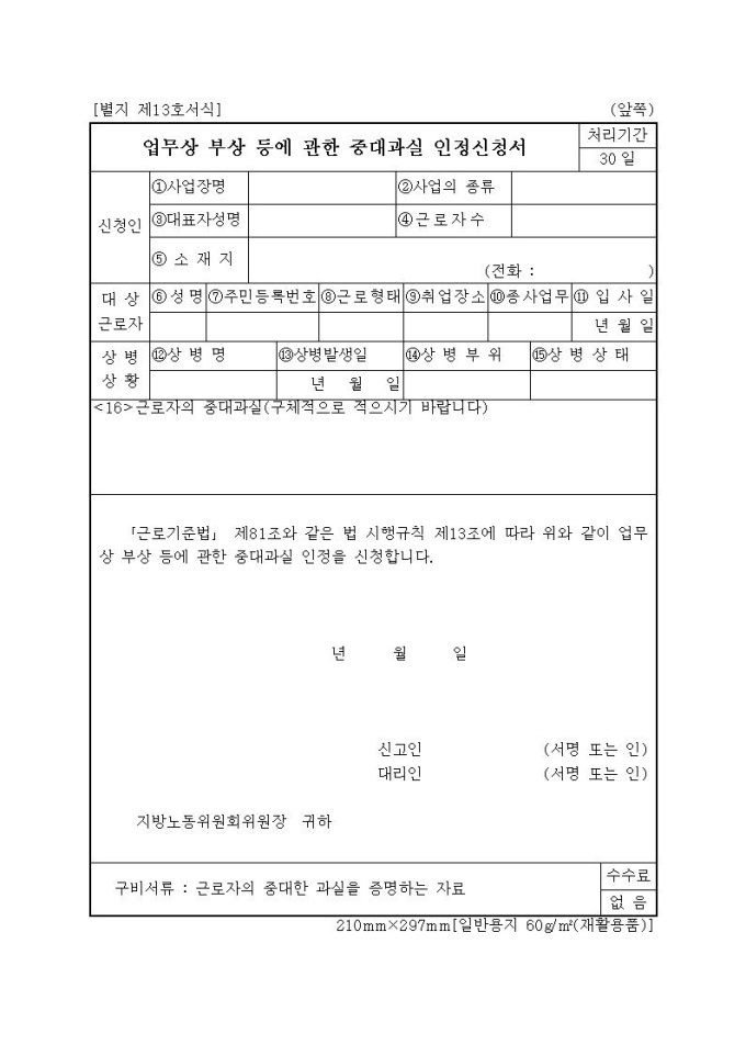 업무상상병에관한중대과실인정신청서