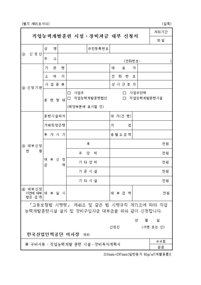 직업능력개발훈련 시설·장비자금 대부 신청서