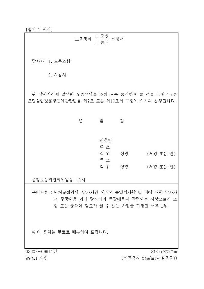 노동쟁의 조정 중재 신청서(교원 노동조합)