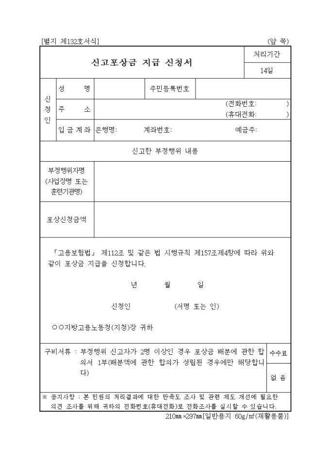 신고포상금 지급 신청서-(고용보험)