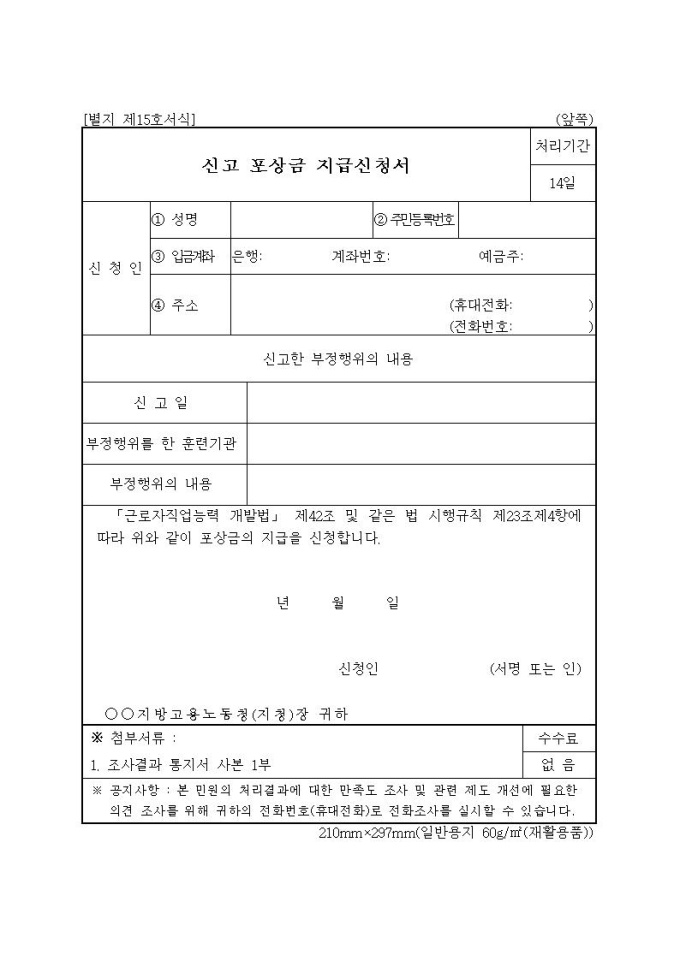 신고 포상금 지급신청서-(직업능력개발사업)