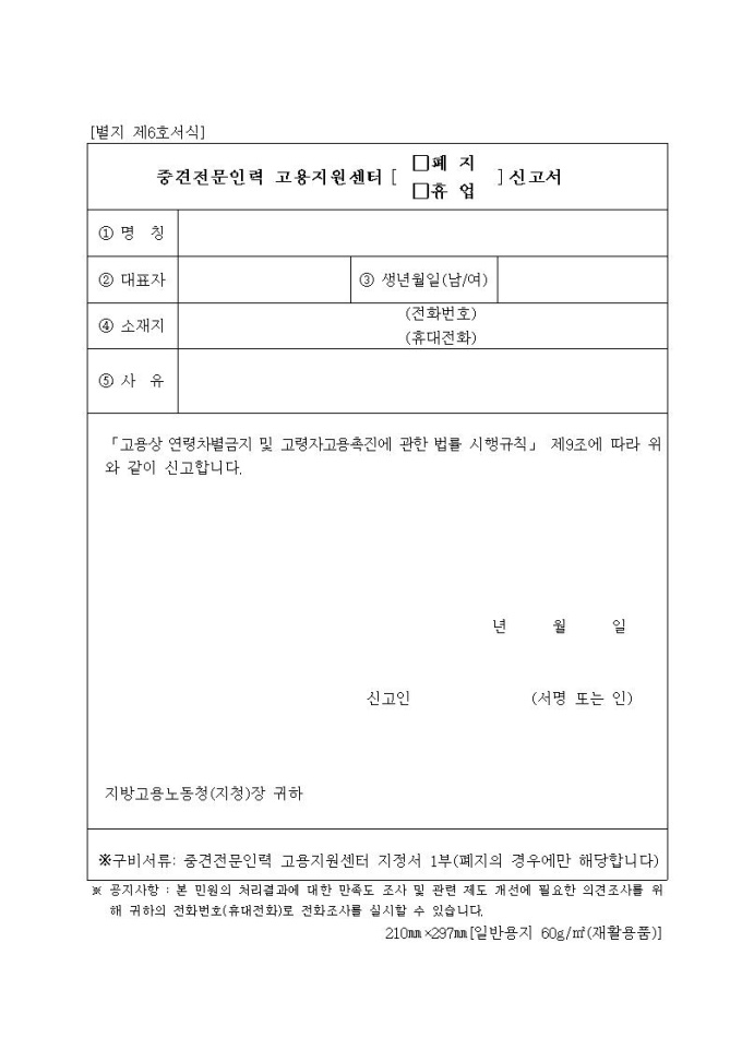 중견전문인력 고용지원센터 □폐지 □휴업 신고서