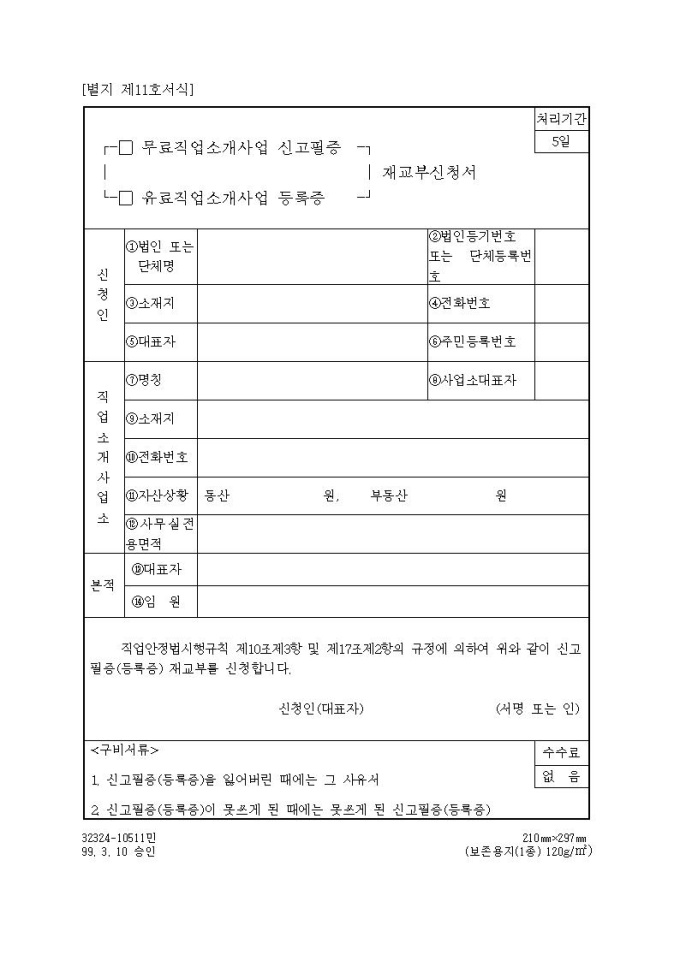무료직업소개사업 신고확인증/유료직업소개사업 등록증 재발급신청서