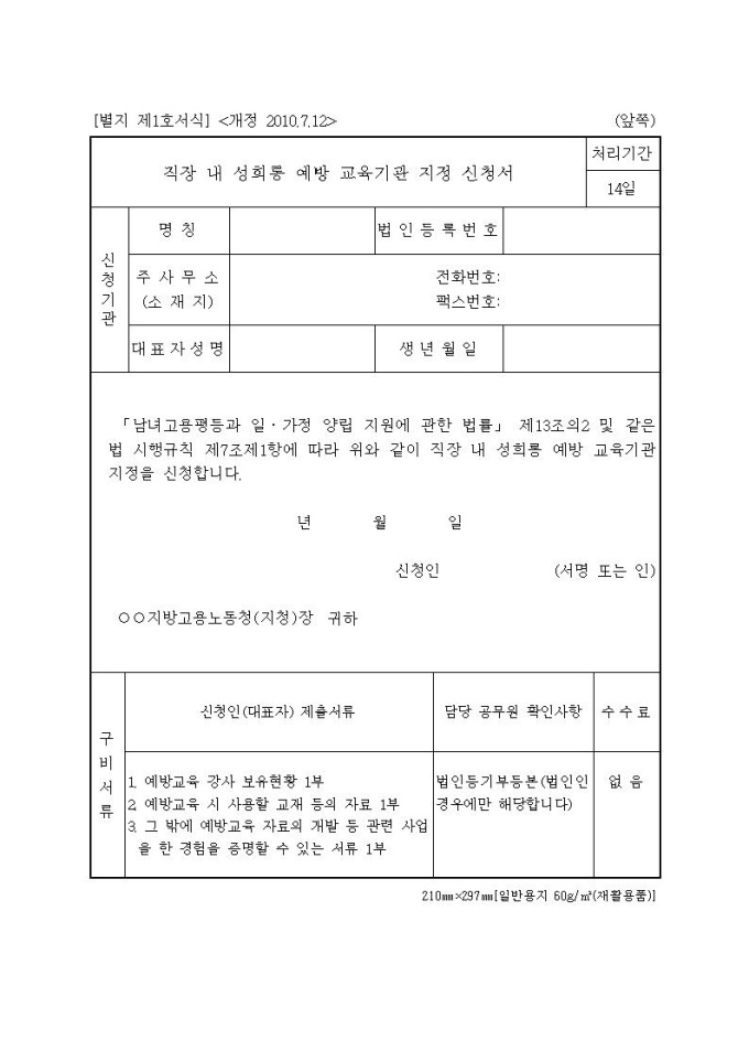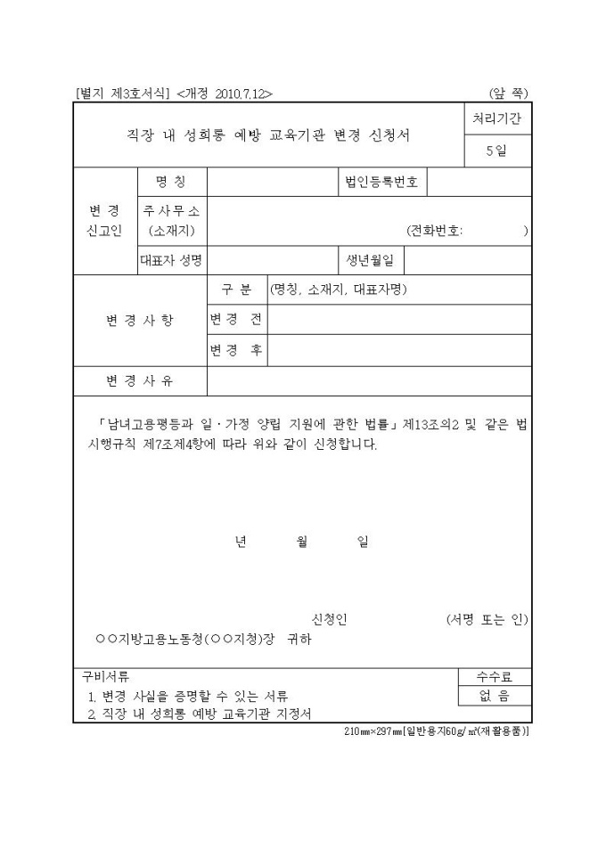 직장내 성희롱 예방 교육기관 지정(변경)신청서