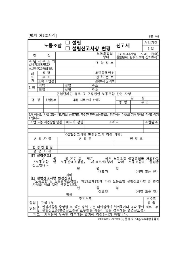 노동조합(설립, 설립변경)신고서