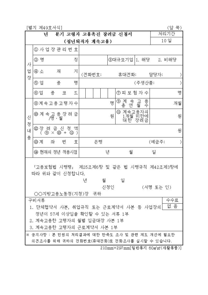 고령자 고용촉진 장려금 신청서(정년퇴직자 계속고용)