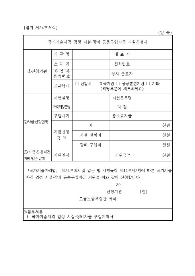국가기술자격 검정 시설·장비 공동구입자금 지원신청서