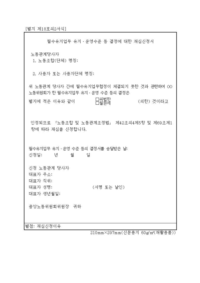 필수유지업무 유지ㆍ운영수준 등 결정에 대한 재심신청서