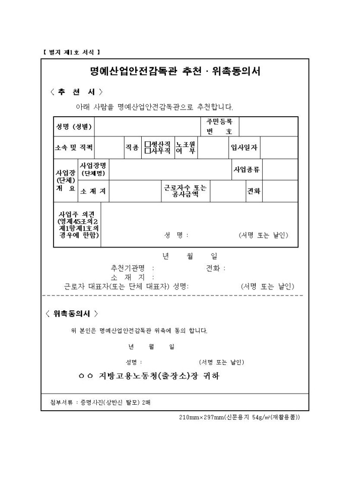 명예산업안전감독관 추천·위촉동의서