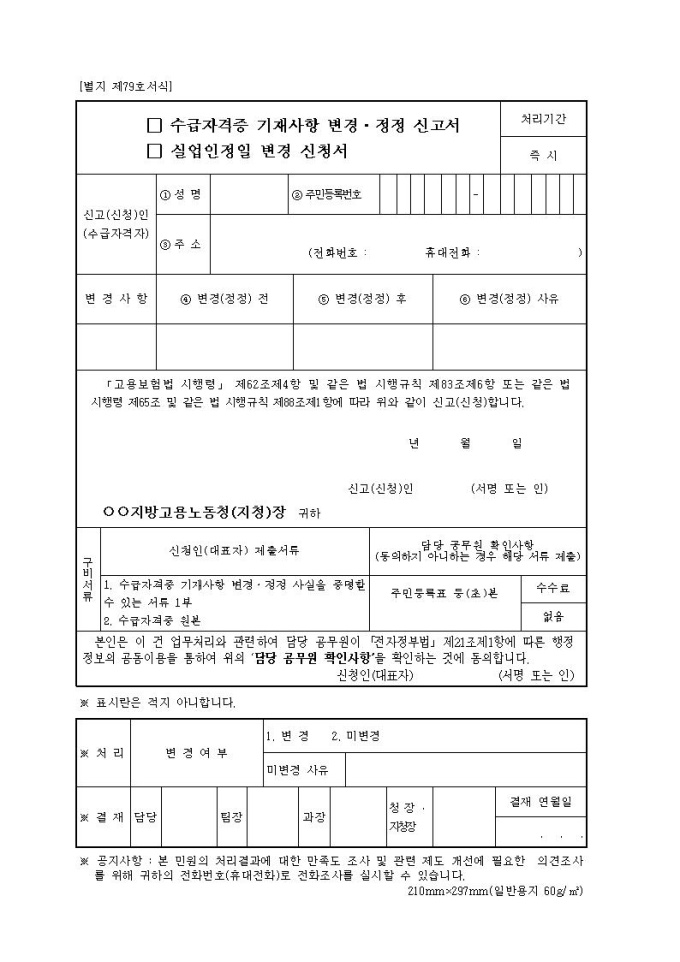 고용보험수급자격증기재사항변경신고서(실업인정일변경신청서)