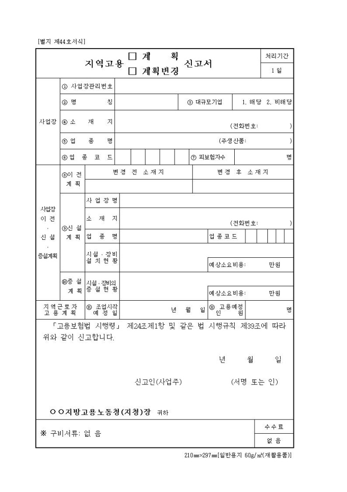 고용보험지역고용계획(계획변경)신고서