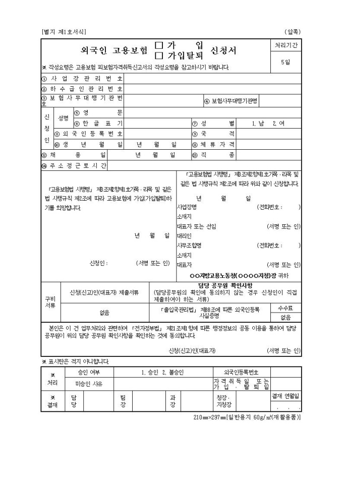 고용보험외국인(가입, 가입탈퇴, 피보험자격취득)신청(신고)서