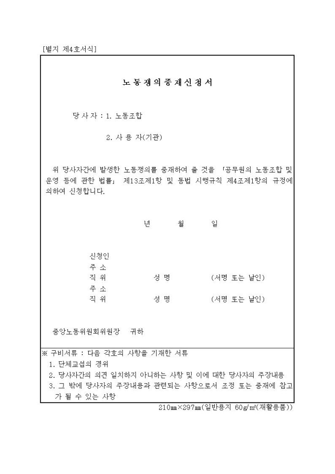 노동쟁의중재신청서(공무원 노동조합)