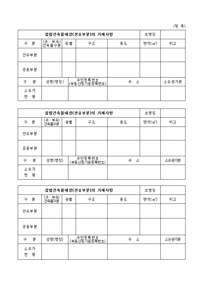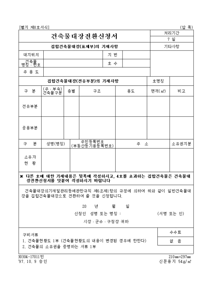 9,000원/월별지 제8호서식 건축물대장의기재 및 관리등에 관한 규칙 제6조제1항의 규정에 의하여 일반건축물대장을 집합건축물대장으로 전환하여 줄 것을 신청할 때 사용하는 양식입니다.