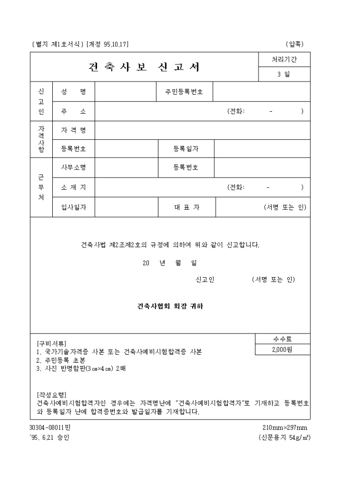 9,000원/월[별지 제1호서식] 건축사법 제2조제2호의 규정에 의하여 건축사보 신고를 할때 사용하는 양식입니다.