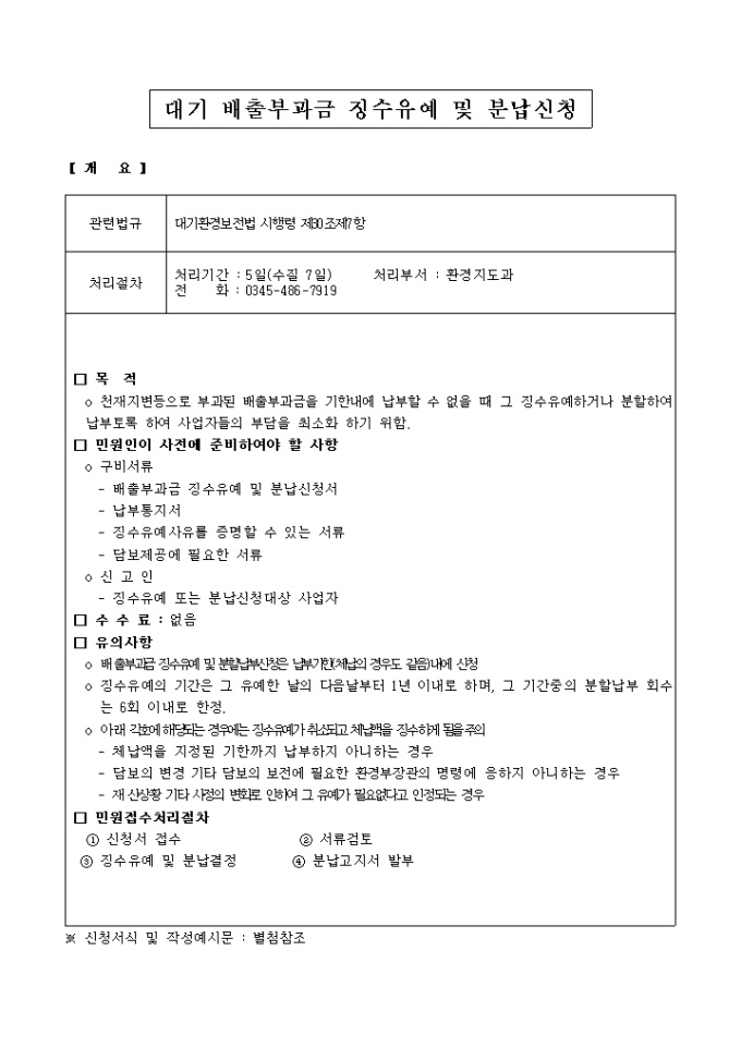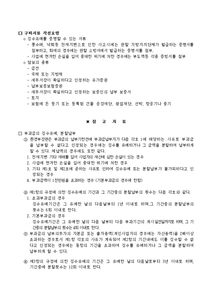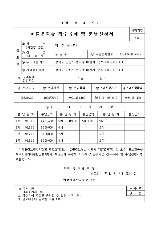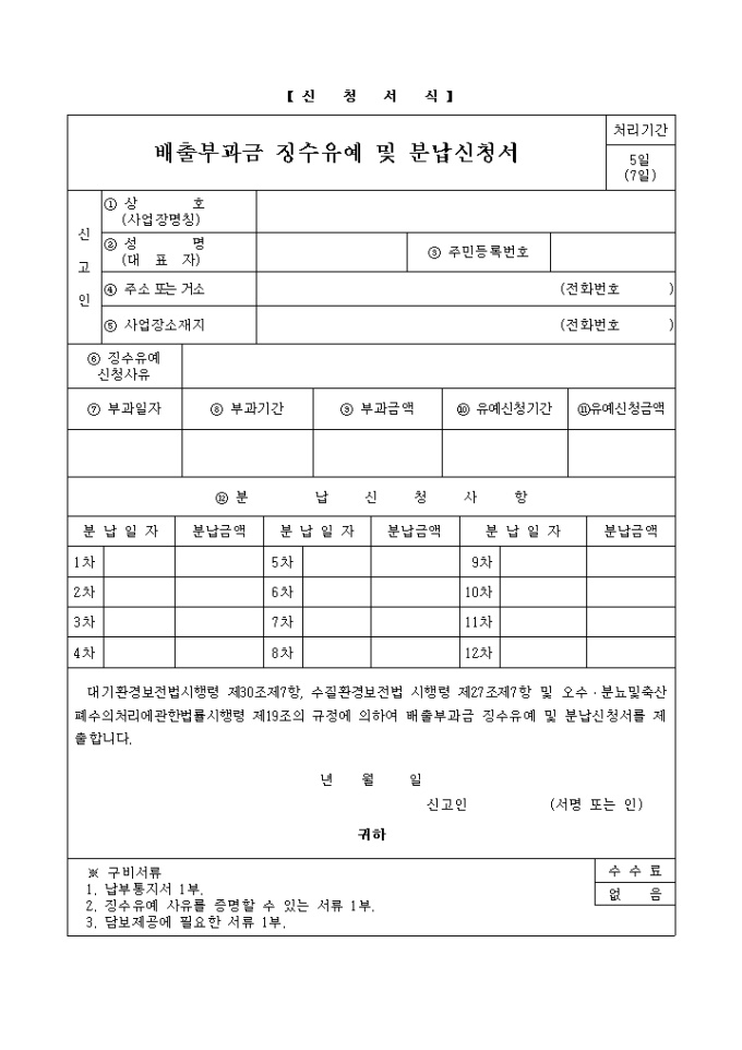 9,000원/월대기환경보전법시행령 제30조제7항, 수질환경보전법 시행령 제27조제7항 및 오수·분뇨및축산폐수의처리에관한법률시행령 제19조의 규정에 의하여 배출부과금 징수유예 및 분납을 신청할 때 사용하는 양식입니다.